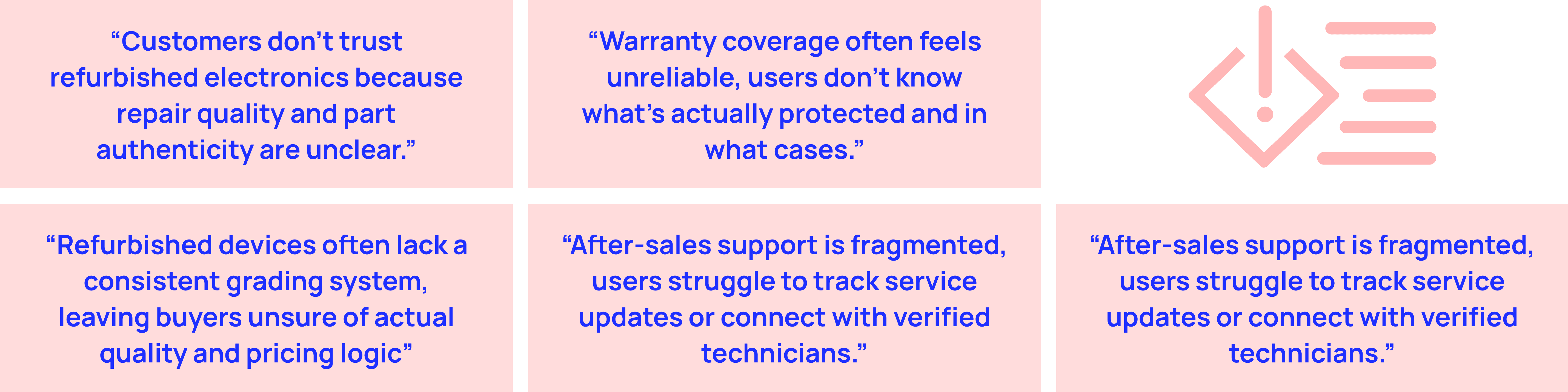 Interviews uncovered recurring anxieties about hidden faults, unreliable warranties, and counterfeit parts.